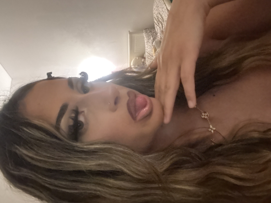 A woman poses for a selfie, tilting her head while sticking her tongue out slightly. She has dark, long eyelashes and well-defined eyebrows, with clips in her hair near her hairline. Her hair is wavy and highlighted. She is wearing a delicate necklace with clover-shaped pendants. Her hand is near her chin. The background is blurry but appears to be a bedroom setting.