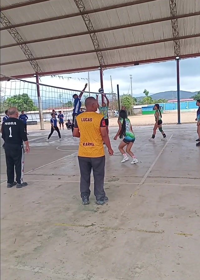 volleyball game in progress. Two teams, one in green and blue and the other in blue and black, are playing on a court under a covered structure. A man in a yellow shirt with "LUCAS" and "KARMA" printed on the back stands on the side, appearing to be a coach or referee. Another man in black with the number "1" and "MORA" on his back is standing on the other side. Players are actively moving around the court, attempting to hit the volleyball over the net. In the background, there is a view of the outdoors, including buildings and mountains. The court is concrete and marked with lines. The atmosphere seems casual, possibly a friendly game.