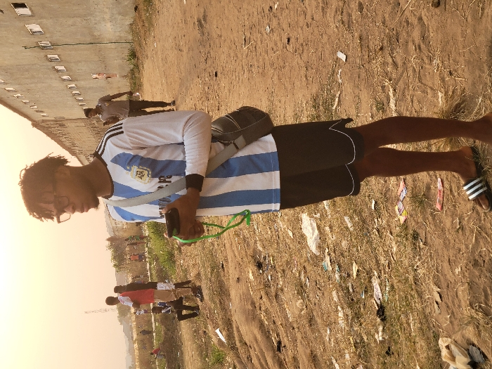 A person with dark hair and glasses is standing outdoors, wearing a white and blue striped Argentina soccer jersey, black shorts, and striped sandals. They are holding a cell phone and a green jump rope. A black bag is slung over their shoulder. A concrete building with windows is on the left side, and other people can be seen in the background. The ground is sandy with trash scattered around.
