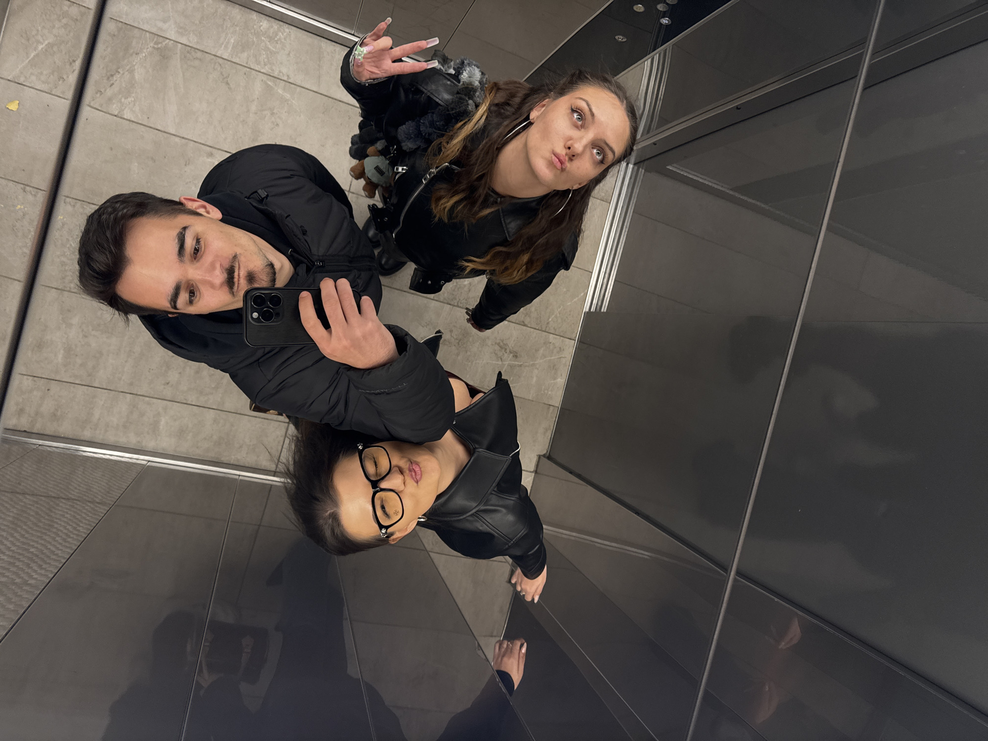 Two individuals are captured in a photo taken from a high-angle perspective, likely inside an elevator. A man holds a smartphone and appears to be taking the picture. A woman stands beside him, posing with her hand raised in a peace sign gesture and puckered lips. The reflection of the pair is visible on a polished surface. They are wearing black jackets and casual clothing. The location cannot be determined from the picture.
