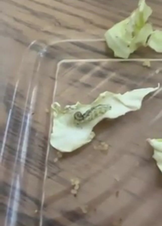 caterpillar on a lettuce leaf, inside a clear plastic container that is on a wood surface. There are other leaves of lettuce scattered in the container. There are small, round objects on the bottom of the container around the lettuce. A white tissue is in the upper background of the shot. A child is heard speaking in the background.