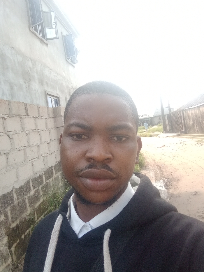 The image depicts an adult male taking a selfie on an unpaved road in Ughelli, Nigeria