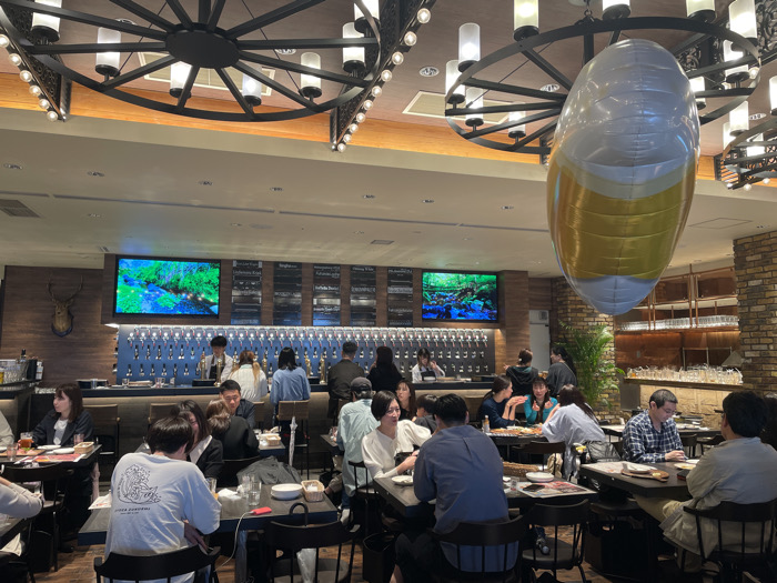 restaurant interior with a large, oval-shaped, white and gold balloon suspended from the ceiling. The restaurant appears to be a gastropub with a long bar, rows of beer taps, and a large screen displaying a nature scene. The restaurant is filled with patrons and staff, and the tables are adorned with drinks, food, and plates. There is a mounted deer head on the wall above the bar, adding to the rustic atmosphere. The image is taken in a brightly lit environment with warm-toned lighting. The scene is bustling with activity, and patrons are engaged in conversation and enjoying their meals. The restaurant is located in Sumida City, Japan, at coordinates 35.71 latitude and 139.812 longitude.