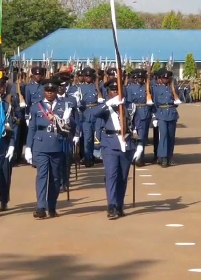 A group of uniformed military personnel is marching in formation across an open, paved area. They are wearing light blue uniforms with dark blue accents, and black hats. They are carrying rifles or flags. In the background, there is a building with a blue roof and another group of uniformed military personnel standing in formation. There are also a few people standing to the side with cameras. The weather appears to be sunny and clear. There are white dots painted on the ground to mark the formation's path.