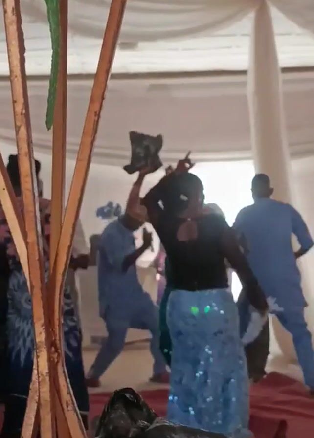 The scene appears to be a celebration, possibly a wedding or party, taking place indoors. Four people are visible in the foreground, dancing on a red rug. Two men are wearing light blue outfits. A woman in a black top and a sparkly blue skirt is the most prominent figure, enthusiastically waving a black object over her head. The room is decorated with white drapes, and there's a wooden structure and a black trash bag in the foreground, partially obscuring the view. Other people are visible in the background, some seated at tables. The overall lighting is bright but somewhat blurred.