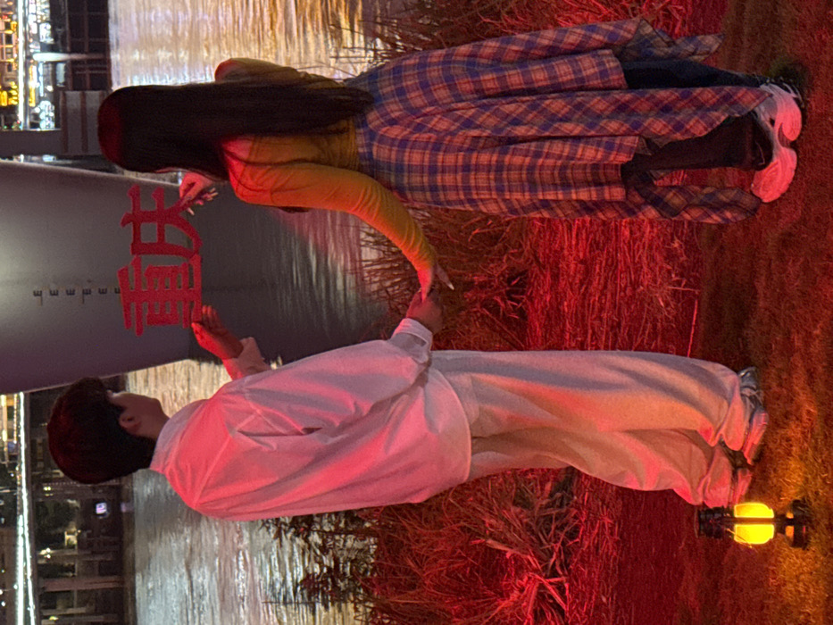 A couple stands holding hands by a river at night. The man wears a white shirt and pants. The woman has long dark hair and is wearing a mustard-colored shirt and a long plaid skirt. They both hold a red paper cutout of Chinese characters. A lit lantern sits on the ground near them. A bridge and lights are visible in the background across the water. A red light source illuminates the scene.