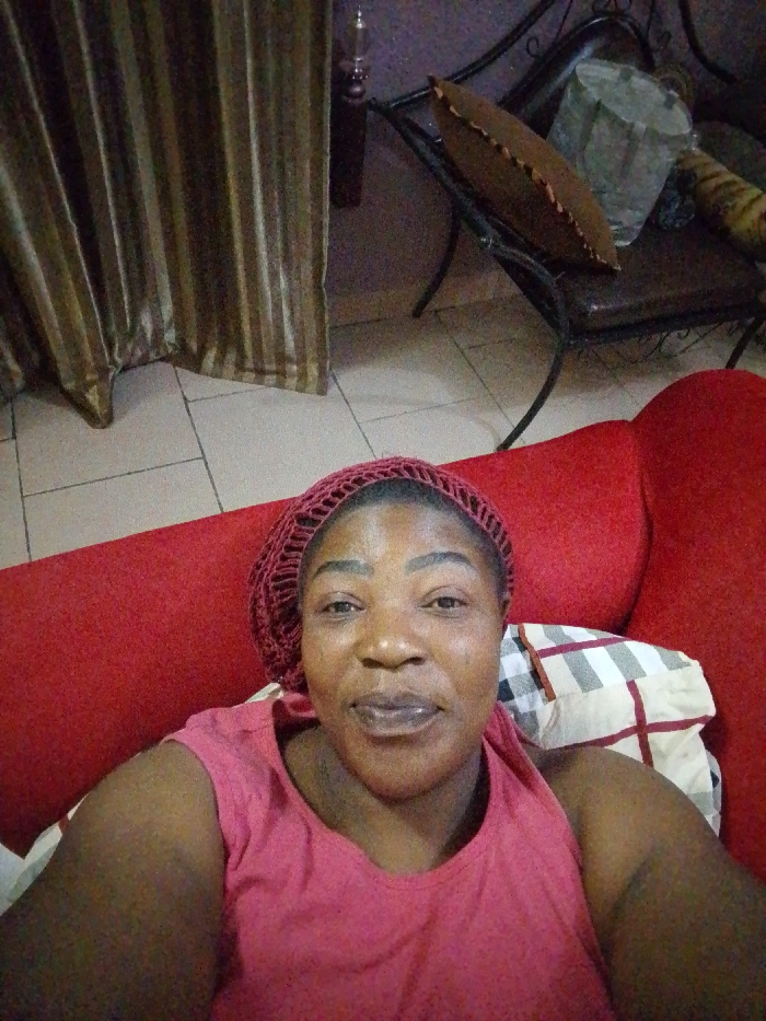 A woman with dark skin and a maroon head covering and shirt lies on a red couch. The couch has a white pillow with red lines on it. Brown and tan curtains are in the background on the left. Behind the couch on the right is a small, black table with a brown pillow, a gray vase, and a long patterned object. The background floor is tiled.