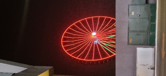 A partially visible Ferris wheel glows with red and green lights against a dark background. To the right, a wall section is visible, featuring a dark green electrical box above a white, vertically divided door with a black handle. A building's corner is visible in the lower left. The scene appears to be taken at night.