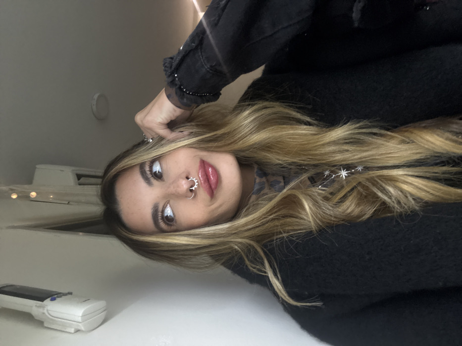 A woman with long, blonde hair and fair skin looks at the camera. She has brown eyes, full lips with glossy lipstick, and pierced nostrils with a large septum ring. She wears a black jacket with a sheer sleeve. Her hair has small, silver star-shaped clips. In the background is a white wall and a white cordless phone.