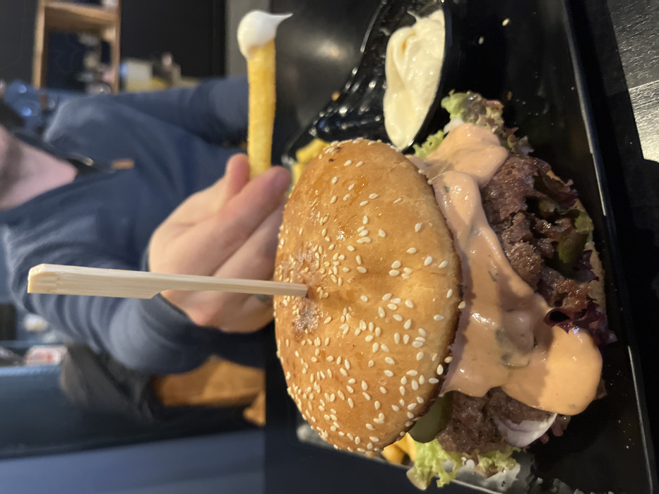 This image displays a meal served within an indoor dining establishment in Meisenheim, Germany. In the foreground, a large hamburger rests on a black rectangular plate, held together by a vertical wooden skewer. The hamburger features a sesame seed bun, a beef patty, green leaf lettuce, sliced pickles, and a substantial application of an orange-pink sauce. To the right of the hamburger, on the same plate, a small black bowl contains a white condiment. Several golden-brown french fries are visible around the hamburger. In the midground, a person's right hand, belonging to an individual wearing a dark blue quarter-zip top, holds a single french fry, the end of which is coated in a white condiment. The person's upper body and face are out of focus in the background, which presents dark surfaces and blurred shelving units.