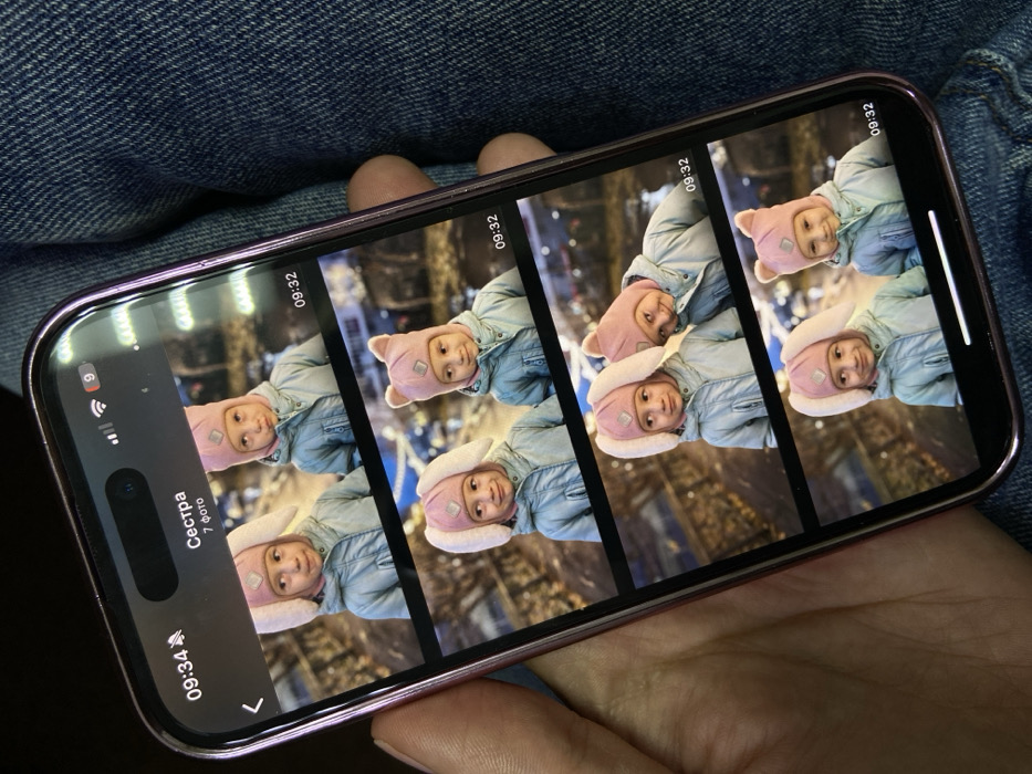 The image presents a close-up, oblique view of an individual's left hand holding a metallic-framed smartphone, likely an iPhone 15 series model due to the visible Dynamic Island. The phone's frame exhibits a purplish-pink hue. The background to the right of the phone reveals a textured blue denim fabric, indicating a person's leg in jeans. The phone's screen displays a photo gallery or messaging application interface, titled "Сестра" (Sister) and indicating "7 фото" (7 photos). The top-left corner of the screen shows the time as 09:34. The screen is filled with a stacked arrangement of four distinct photographs. Each photograph features two young children, possibly siblings, dressed in light blue or mint green puffer jackets, suggesting cold weather attire. One child consistently wears a pink hat with large, white-lined ear flaps resembling bunny ears, marked with a central diamond-shaped emblem. The other child wears a pink hat with smaller, rounded ear-like protrusions, resembling cat ears, also featuring a central diamond emblem. The children's expressions vary across the images, displaying slight smiles, pouting, or looking towards the side. The background within the displayed photographs depicts an outdoor, natural environment consistent with late autumn or early winter in a northern climate. Visible elements include blurred deciduous trees with sparse yellow-brown foliage or bare branches, and indistinct urban lights or structures in the distance. This environmental context aligns with typical conditions found in the city of Ust-Ilimsk, Russia, known for its continental subarctic climate.