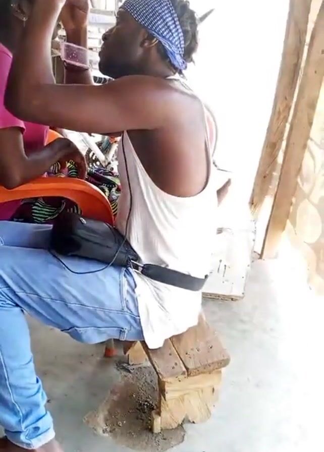 man sitting on a wooden stool outdoors, seemingly working on a customer's hair. He wears a white tank top, blue jeans, and a blue bandana. A small black bag hangs from his waist. The customer is partially visible, wearing a pink top and seated on a colorful chair. The camera then pans to show a street view with shacks or stalls, dirt roads, and some litter on the ground. The overall scene appears to be in a less developed or impoverished area.