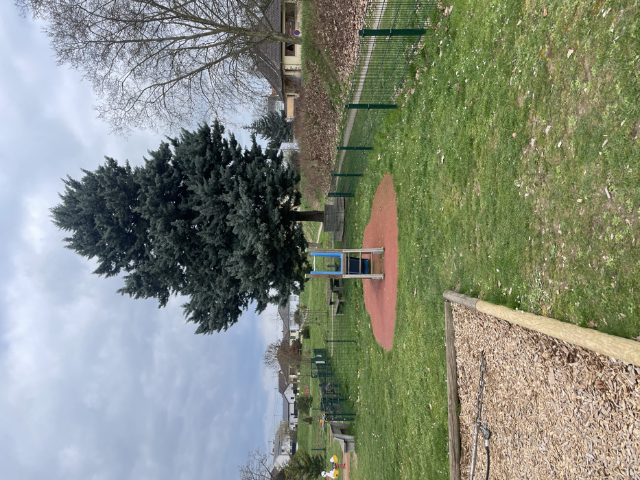The image depicts an unoccupied public park or playground located in Holtzheim, France, under an overcast sky. In the foreground, a section of an outdoor play area is visible, defined by light-colored wooden logs enclosing a surface covered with light brown wood chips. Metal chain elements are present within this area. The dominant ground cover consists of green grass with sparse patches of lighter vegetation and scattered small debris. Slightly right of the image center, a child's slide is positioned on an irregular, red rubber safety mat. The slide features a blue chute and gray support structure. Directly behind the slide, a large, dark green conifer tree stands centrally, with a square wooden structure, possibly a planter or bench, around its base. To the left of the conifer and slide, a green metal mesh fence encloses a portion of the playground. Within this fenced area, a wooden picnic table with benches is visible. Further to the left, a yellow duck-shaped spring rider, an additional spring rider, a wooden bench, and a small sandpit with an adjacent structure are present. The green metal mesh fence extends to the right of the slide, bordering a narrow, light-colored dirt path. In the background, beyond the fence and path on the right, an elevated bank covered with brown fallen leaves rises, partially obscuring a light-colored building with a brown tiled roof. Bare deciduous trees are scattered across this bank. In the background to the left and center, multiple residential houses with varying architectural styles and rooflines are visible, indicative of a suburban or village environment. Overhead utility lines are discernible against the cloudy sky in the upper left background. No individuals are present in the scene. The overall lighting is diffused, consistent with an overcast day. The bare deciduous trees and fallen leaves indicate a dormant season, such as late autumn, winter, or early spring.