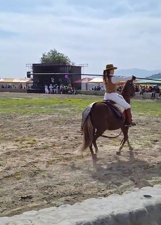 The scene is an outdoor horse arena. A woman wearing a tan vest, white pants, and a wide-brimmed hat rides a chestnut-colored horse in the center of the arena. She holds her arms out to her sides. The ground is mostly dirt with patches of green grass. A low stone wall surrounds the arena. In the background, there is a crowd of people seated under tents and a stage with people standing on it. Mountains can be seen in the far distance under a sky with scattered clouds.