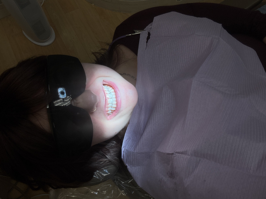 A subject, identified as female, is depicted in a dental office in Atlanta, United States. She wears large, dark protective goggles, reflecting a central blue light source. A metallic ring pierces her left nostril. Her mouth is open in a grimace, exposing upper and lower teeth, which appear coated with a light-colored substance, indicative of a dental procedure. A disposable, light purple dental bib is clipped around her neck, covering a dark red garment. The background shows blurred clinical equipment, including a light-colored apparatus to the right and plastic sheeting to the left, with a light-toned floor. Illumination is focused on the subject's mouth area.