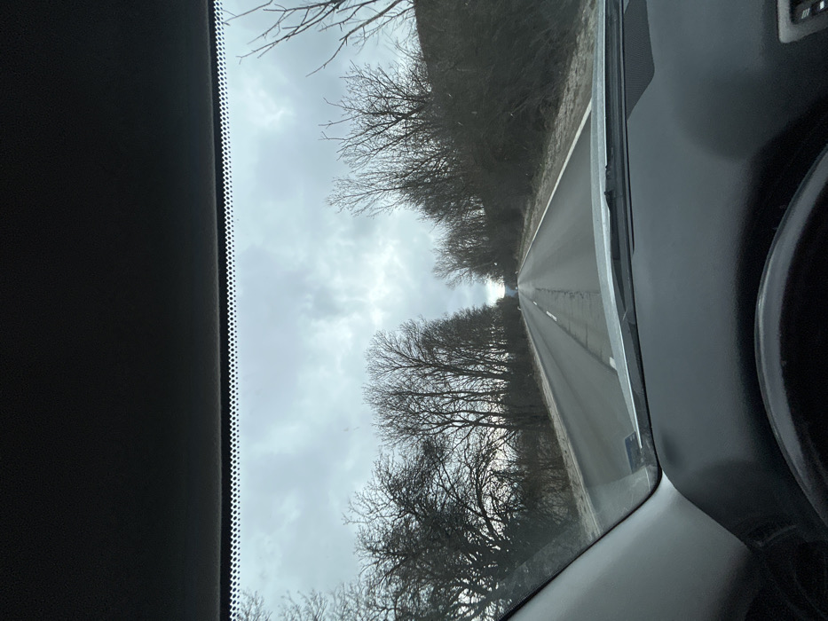 The image presents a forward-facing view from inside a vehicle, through its windshield, capturing a straight asphalt road extending into the distance