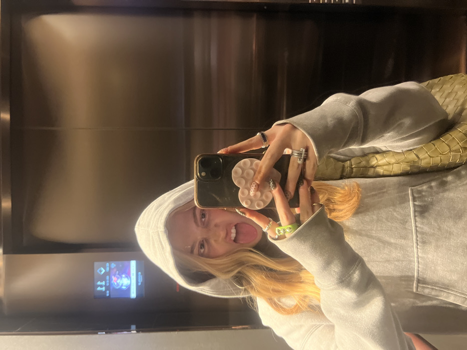 The image depicts a mirror selfie taken inside a modern elevator, likely located within the W Hotel Chengdu, China. This deduction is supported by a digital display reflected in the upper left background, which prominently shows the text "QUEEN'S" and "W," suggestive of the hotel brand and a specific venue or service within it. The primary subject is a young adult, appearing female, captured from the chest upwards. She has long, wavy, reddish-blonde hair, partially framed by a light grey hooded sweatshirt, worn with the hood up. Her expression is playful, characterized by an extended tongue and slightly bared teeth. She holds a black smartphone in her right hand, positioning it to capture her reflection. The phone is equipped with a light-colored, heart-shaped pop socket on its back, adorned with smaller circular elements, some featuring pink accents. Both hands display multiple rings on various fingers, and her fingernails are painted a dark color, some featuring white dot patterns. A lime green bracelet is visible on her left wrist. A light olive green or yellowish-green woven shoulder bag, with a textured pattern, is partially visible on her left side. The elevator interior is constructed with reflective, brushed metallic panels that act as the mirror. The digital display visible in the reflection includes illuminated graphics and text, indicating elevator status, floor information, or promotional content related to the W Hotel.