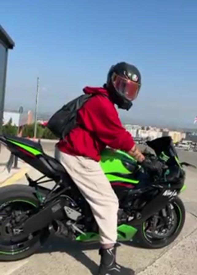A person wearing a red hoodie, light beige pants, black riding boots, a black backpack, and a black helmet with a red visor is sitting on a green and black Kawasaki Ninja motorcycle. The person is holding the motorcycle's handlebars and appears to be revving the engine, as the motorcycle sound is clearly audible. The bike is parked on an asphalt surface next to what seems to be a bus stop or some kind of shelter. In the background, there is a cityscape visible under a clear blue sky. A person is seen walking in the background as well.