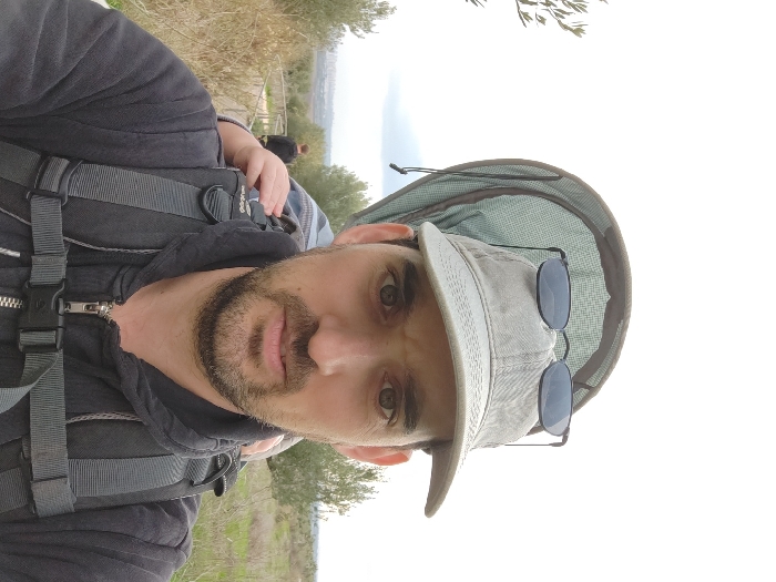 An adult male is depicted in a close-up selfie, facing the camera