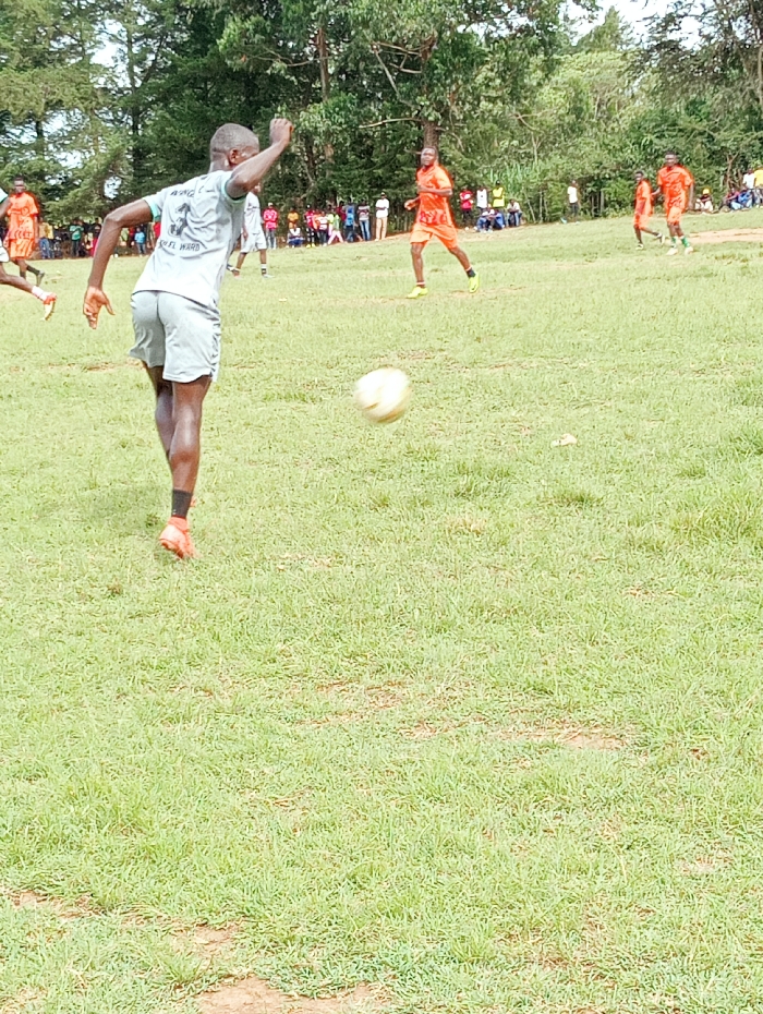 A soccer match is underway on a grassy field in Ngenyilel ward, Kenya