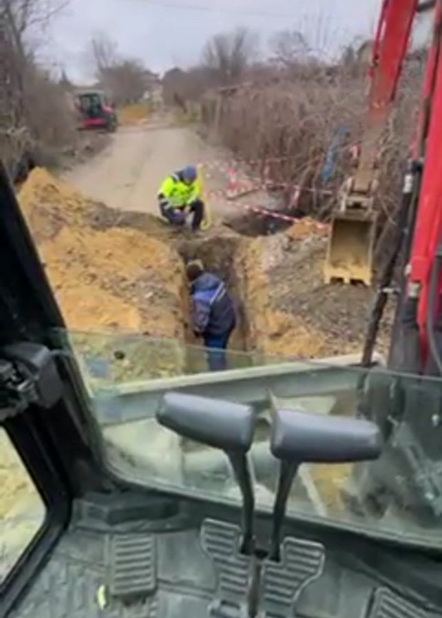 From the perspective of inside the cab of a red mini excavator, two workers are visible digging in a narrow trench in a dirt road. One worker in a yellow safety vest crouches at the edge of the trench, appearing to supervise or assist the other worker. The second worker, wearing a blue jacket, is inside the trench, actively digging with a shovel. Red and white barrier tape marks the immediate work area, and a second mini excavator is parked further down the dirt road. The sky is overcast, and there are bare trees and bushes visible in the background. The excavator's control levers are prominent in the foreground.