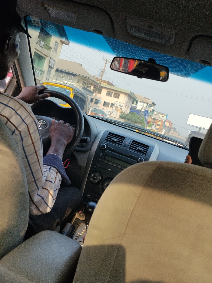 From the backseat of a car, a driver with a plaid shirt is visible, hands on the steering wheel