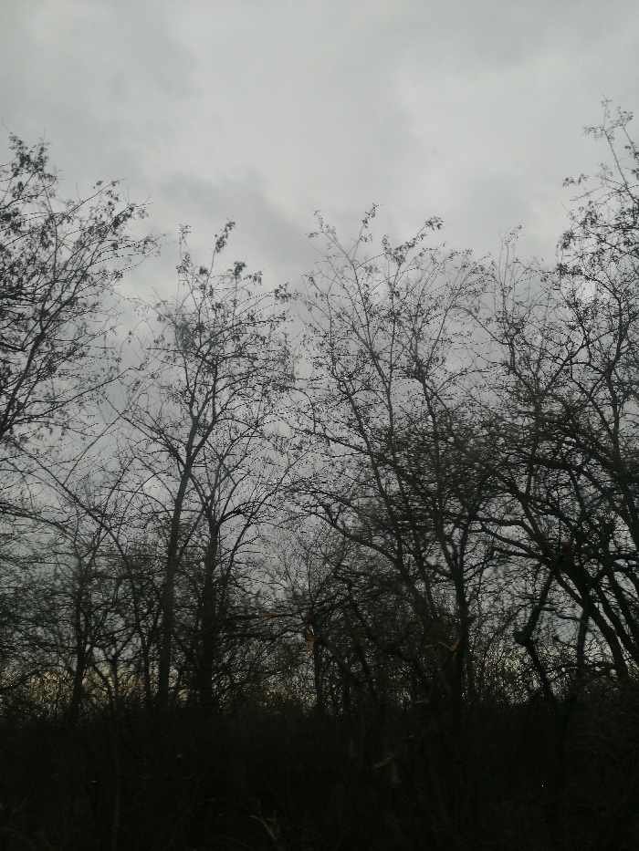 The image displays a dense tree line in Zagore, Bulgaria, under an overcast sky. The upper approximately 40% of the frame is occupied by a light gray, cloudy sky. Below this, numerous deciduous trees with dark, bare branches, some showing sparse buds or remnants of dark foliage, are silhouetted against the sky. The tree canopy is dense, with branches crisscrossing throughout the mid-ground. The lowest portion of the image, approximately 30%, consists of dark, dense undergrowth or shrubbery at the base of the trees. Lighting is diffused and dim. No people, animals, or man-made structures are visible.