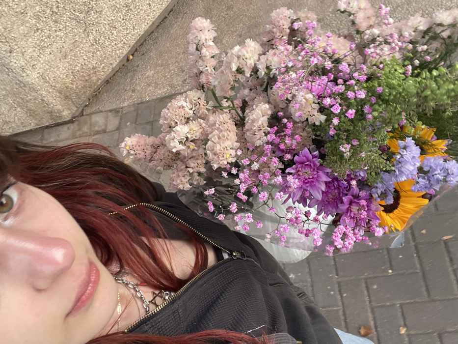 A person with reddish-brown hair and olive skin is holding a large bouquet of flowers