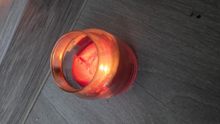 - "A single, cylindrical, transparent glass jar containing a red-colored, partially melted wax candle with an active, bright flame is centrally positioned on a dark grey-brown wooden plank or laminate flooring surface" by FM-UgNOv2, licensed under CC BY 4.0