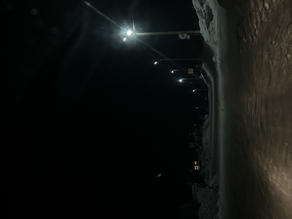A dark night scene features a road illuminated by streetlights. Snow banks line the right side of the road. The streetlights recede into the distance, casting a glow on the icy road surface. The sky is black, contrasting with the bright lights and the reflective road. Signs are visible along the road, adding detail to the urban setting.