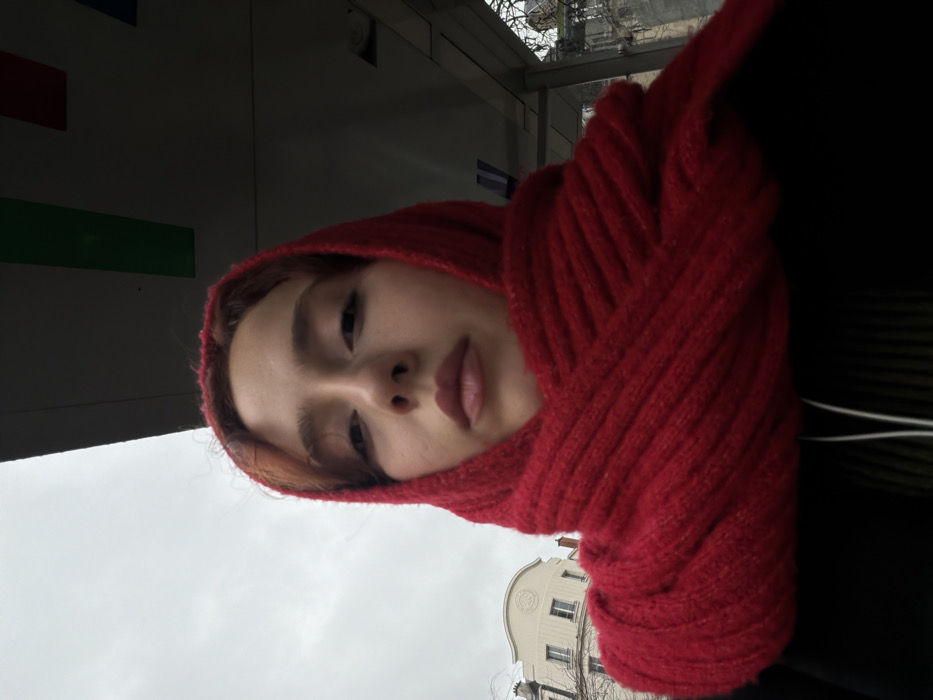 A young adult female is depicted in a close-up, low-angle outdoor selfie, looking directly at the camera. She has reddish-brown hair visible around her forehead and is wearing a thick, ribbed, bright red knitted scarf or cowl wrapped around her head, neck, and shoulders. A dark, vertically ribbed garment, possibly black or dark green, is visible beneath the scarf, with a thin white cord hanging centrally. The overcast sky is light grey, indicating a cloudy day. In the left background, a light-colored, multi-story building with a distinctive curved facade and a circular decorative relief on an upper level is visible, partially obscured by bare tree branches. Overhead and to the right, a modern architectural canopy, possibly part of a bus shelter, features a dark underside with visible rectangular panels in red, green, and blue. Beyond this canopy, faint details of a darker, possibly Gothic-style building are discernible, along with additional bare tree branches. This scene is located in the city of Reims, France, specifically at a public transport stop with the characteristic colored canopy, likely near the Reims Cathedral given the architectural clues in the background.