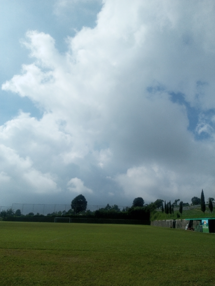 The image depicts an outdoor sports complex situated in the city of Unknown, Vietnam, under a partially overcast sky. The upper portion of the frame is dominated by a mixture of large, diffuse grey and white clouds, with discernible patches of clear blue sky visible. The foreground and midground feature an expansive, well-maintained green grass field, consistent with a soccer pitch, where a white-framed soccer goal is positioned towards the left side. No individuals are visible on the field. The far perimeter of the field is bordered by a dark green, dense hedge. Behind this hedge, a tall, light-colored fence, likely chain-link, is visible. Beyond the fence, a treeline composed of various deciduous and evergreen trees extends across a gently rising terrain. On the far right, several tall, slender evergreen trees stand on a grassy slope, adjacent to a small, open-sided structure with a green roof and panels displaying blue, green, and orange colors.