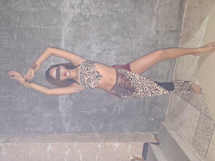 A single female subject, appearing to be in her mid-20s, stands barefoot, full-body, facing the camera in a posed stance. She has light brown, curly hair. Her arms are raised above her head, bent at the elbows, with hands crossed at the wrists and fingers extended upwards. Her left leg is slightly bent, and her right leg is straight. She wears a costume featuring animal print (leopard/jaguar pattern), consisting of a strapless bandeau top, an asymmetrical wrap skirt worn over red shorts, matching wristbands, and a lower leg wrap with a cuff on her left leg. Her face is adorned with white and red face paint, including a horizontal red stripe across the eyes, white lines extending from the lower eyelids and outer eye corners, white dots on the forehead, and white markings on the cheeks and chin, complemented by red lipstick. The environment is an interior or semi-enclosed space. The background consists primarily of a textured, mottled gray concrete wall. To the far left, a corner is visible, transitioning to a lighter, possibly tan-colored, textured vertical surface. Two light-colored, speckled concrete or terrazzo steps are partially visible on the far left, leading upwards. The floor is made of the same light-colored, speckled concrete or terrazzo material. The scene is illuminated by an artificial light source, creating soft shadows. The location is Porlamar, Venezuela.