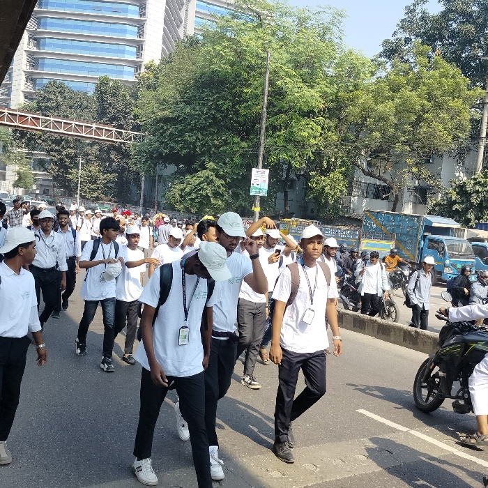A large group of people, mostly young men, are walking along a busy street. They are uniformly dressed in white shirts, dark pants, and white caps. Some carry backpacks. Vehicles, including cars and motorcycles, share the road. A tall building is visible in the background, as well as trees. The lighting indicates it is daytime.