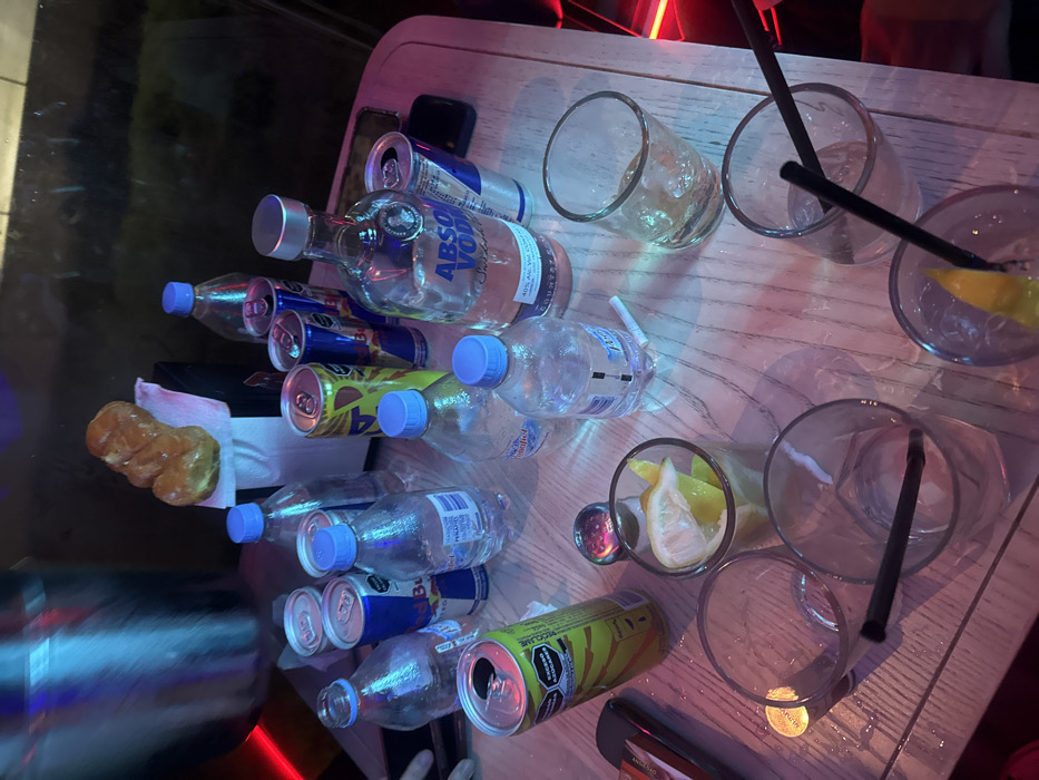 - "The image captures an overhead perspective of a light-colored wooden table laden with various drinking containers and related items, likely within a bar or club in Tijuana, Mexico, given the visible Mexican product labels and general ambiance" by FM-egfBY2, licensed under CC BY 4.0