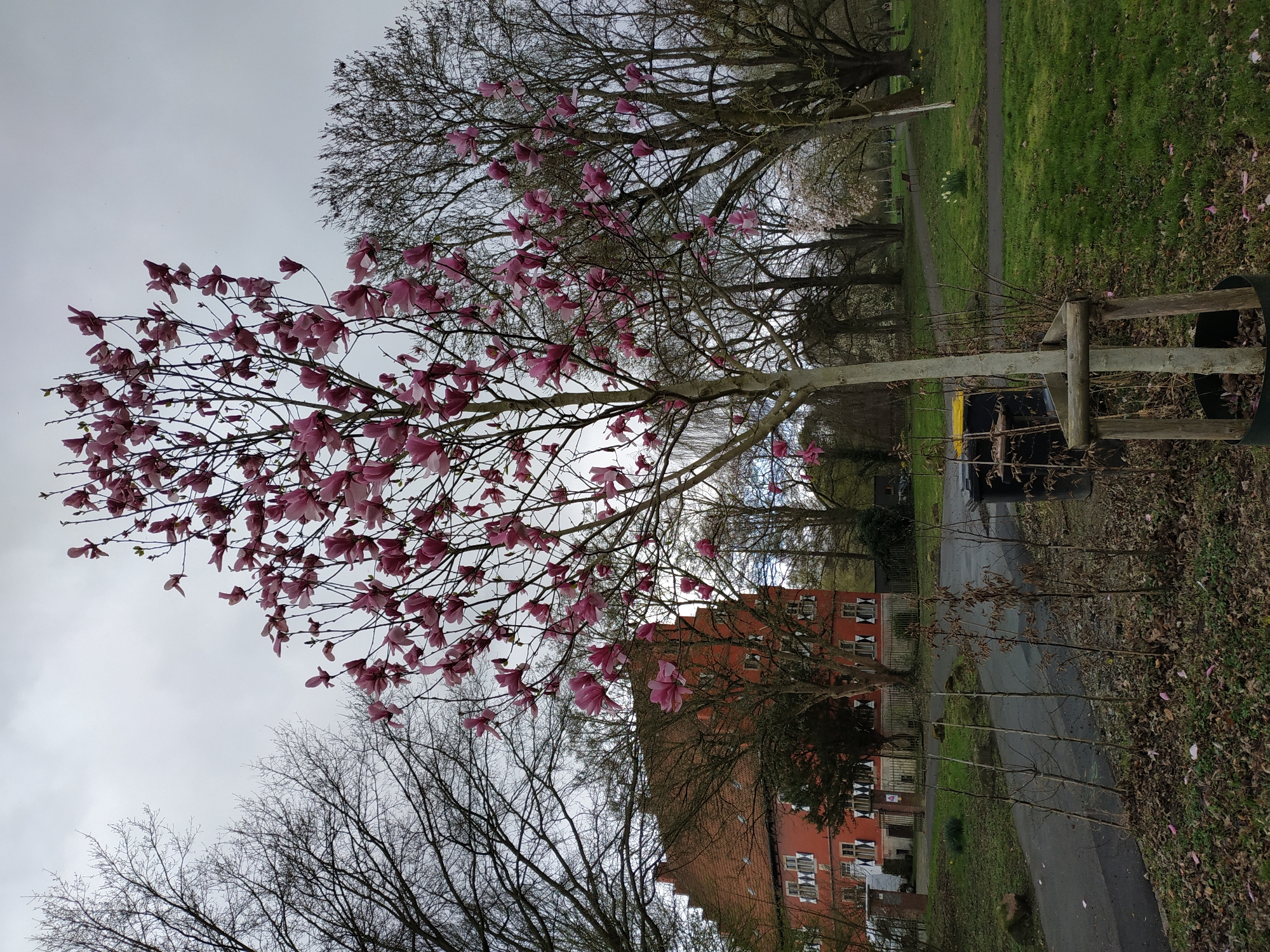 The scene depicts an overcast, early spring view within Rodenbergpark in Aplerbeck, Dortmund, Germany. A blooming magnolia tree with numerous pink flowers occupies the central foreground. Its pale trunk is stabilized by a triangular wooden support frame and a black cylindrical barrier at its base. Fallen pink petals are scattered on the dark leaf litter and sparse green ground beneath the tree. To the immediate right of the magnolia, a dark grey municipal waste bin with a yellow lid is positioned. A paved asphalt path curves from the lower left foreground towards the mid-right. In the midground, to the left of the magnolia, a row of small, bare saplings lines the path. The prominent, gabled, red brick building of Haus Rodenberg is visible, featuring multiple white-framed windows adorned with black-and-white striped shutters. Beyond the main path, areas of green grass contain clusters of yellow daffodils. Numerous bare deciduous trees are distributed throughout the park, with a dense line forming the background. A solitary red chair is positioned on a grassy area in the far right midground, adjacent to another curving path. No individuals are present in the depicted scene.