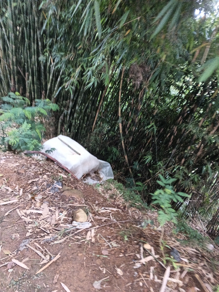 A slightly tilted shot shows a cluttered natural setting. Bamboo stalks rise vertically, creating a dense background. Lush green foliage fills the top right corner, with some greenery near the bottom left. In the foreground, the ground is covered with brown leaves and dirt. A white object, possibly plastic or a container, rests on the ground, partially obscured. A rock and some scattered debris are also visible.