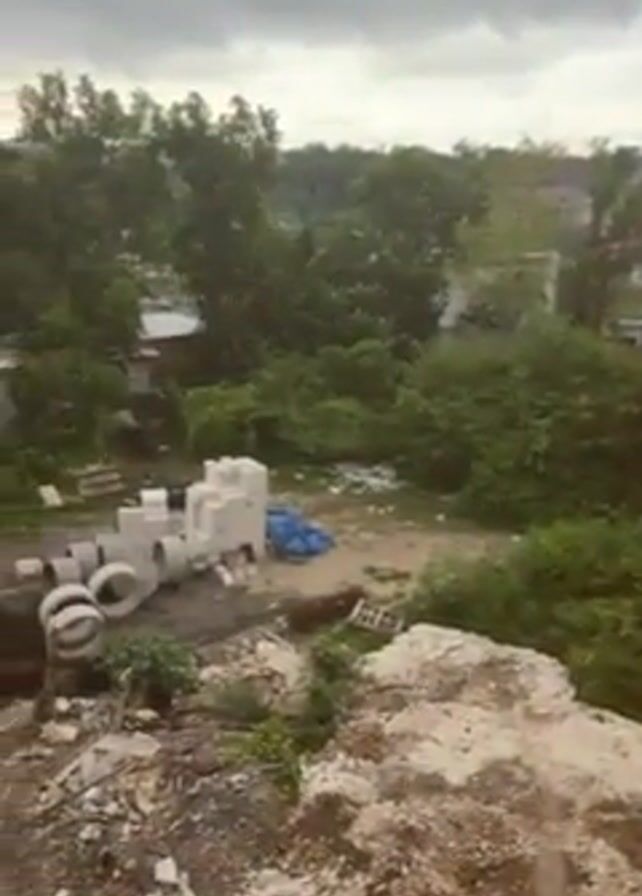 n elevated view of a construction or dumping site on a cloudy day. Visible elements include: several concrete rings and rectangular blocks, a blue tarp, construction materials, and general debris scattered across the area. Lush green trees and vegetation surround the site, with a few houses visible in the background. There are also several individuals visible in the video. The details of their activities are hard to discern, however, the setting and the items around them suggest it's a construction site or possibly an illegal dumping site.