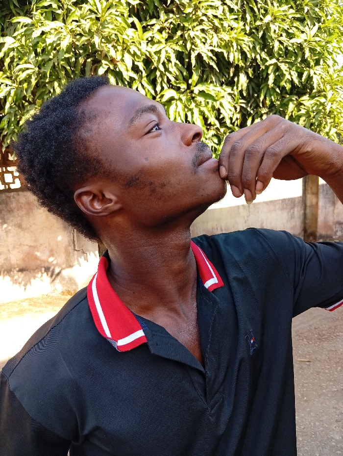 A male individual is depicted in an outdoor setting in Jos, Nigeria, illuminated by bright daylight