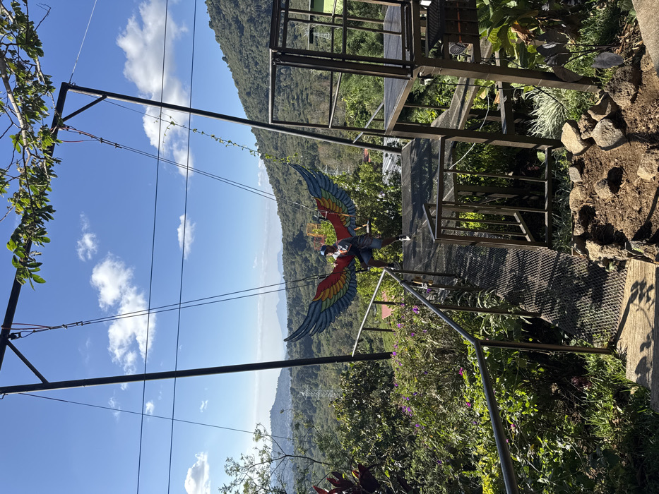 A person is suspended in the air, secured to a cable by a harness with large, colorful wings attached. The person is facing away from the viewer, with a mountain range in the background under a blue sky dotted with clouds. A metal structure, possibly part of a zip line or viewing platform, is visible to the right, amidst lush green vegetation. The landscape suggests a tropical or mountainous region.