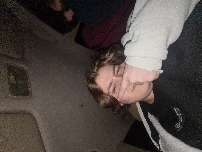 The image depicts the interior of a vehicle, with a grey fabric headliner visible, containing an embedded rectangular overhead light fixture. The specific location in Barza Municipality, Syria, cannot be independently verified from the visual information presented. In the foreground, a young adult male with light brown, wavy hair and light facial stubble is visible from the chest up. He is wearing a dark, long-sleeved shirt featuring a circular white logo on the left chest, and a light-colored, textured garment draped over his left shoulder. He faces the camera, his right eye partially closed, while his right index finger is held against the right side of his nose, below the bridge. In the upper right background, a second individual's head and shoulder are partially visible. This person appears to be male, with dark hair and a beard, looking towards the right of the frame, away from the camera. Dark red fabric, possibly upholstery or a blanket, is seen near this individual. The scene is dimly lit.