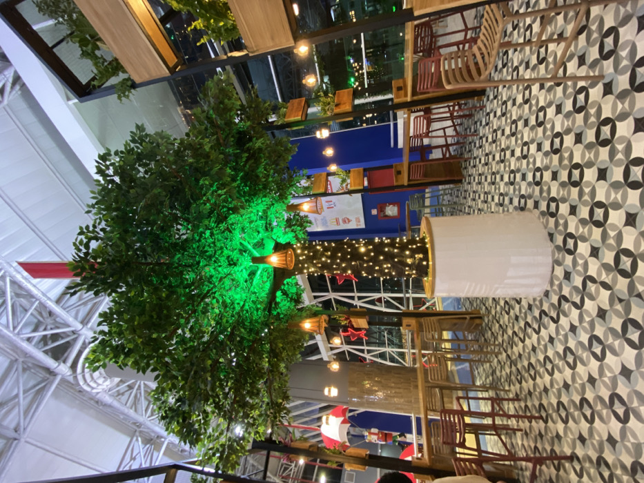An indoor space displays a vibrant, large artificial tree illuminated with green lights, contrasting with string lights adorning the background. Furnishings include various seating arrangements and tables. The floor features a geometric tile pattern. Overhead lighting fixtures and decorative elements enhance the space. A sizable cylindrical object sits prominently among the tables. The scene gives off a festive, vibrant ambiance.