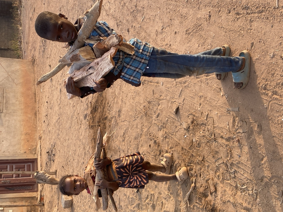 Two children carry firewood. One, older, wears jeans and a blue checkered shirt, holds a large bundle. The other, younger, in a patterned dress, carries a smaller load. They stand on dusty ground near a building. Footprints are visible in the dirt.