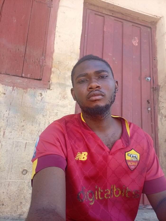 A dark-skinned male with a short beard and mustache faces the camera from a head-and-shoulders perspective, looking directly forward. He wears a red short-sleeved football jersey with a yellow collar trim, featuring a gold "New Balance" logo on the right chest, a gold "digitalbits" sponsor logo on the abdomen, and a shield-shaped "ROMA 1927" club crest on the left chest. The jersey also displays a subtle patterned texture. He is positioned outdoors against a weathered building facade. To his left, a closed, dark red wooden shuttered window is visible, with a small section of a lighter brown wooden frame at the top. To his right and behind him, a closed, dark red wooden door with visible vertical panels and a silver-colored knob/lock is present. The building wall is a light, possibly beige or off-white, with visible cracks and discoloration, indicating age and exposure to elements. The lighting suggests daylight. The specific location in Unknown, Unknown is not discernible from the image.