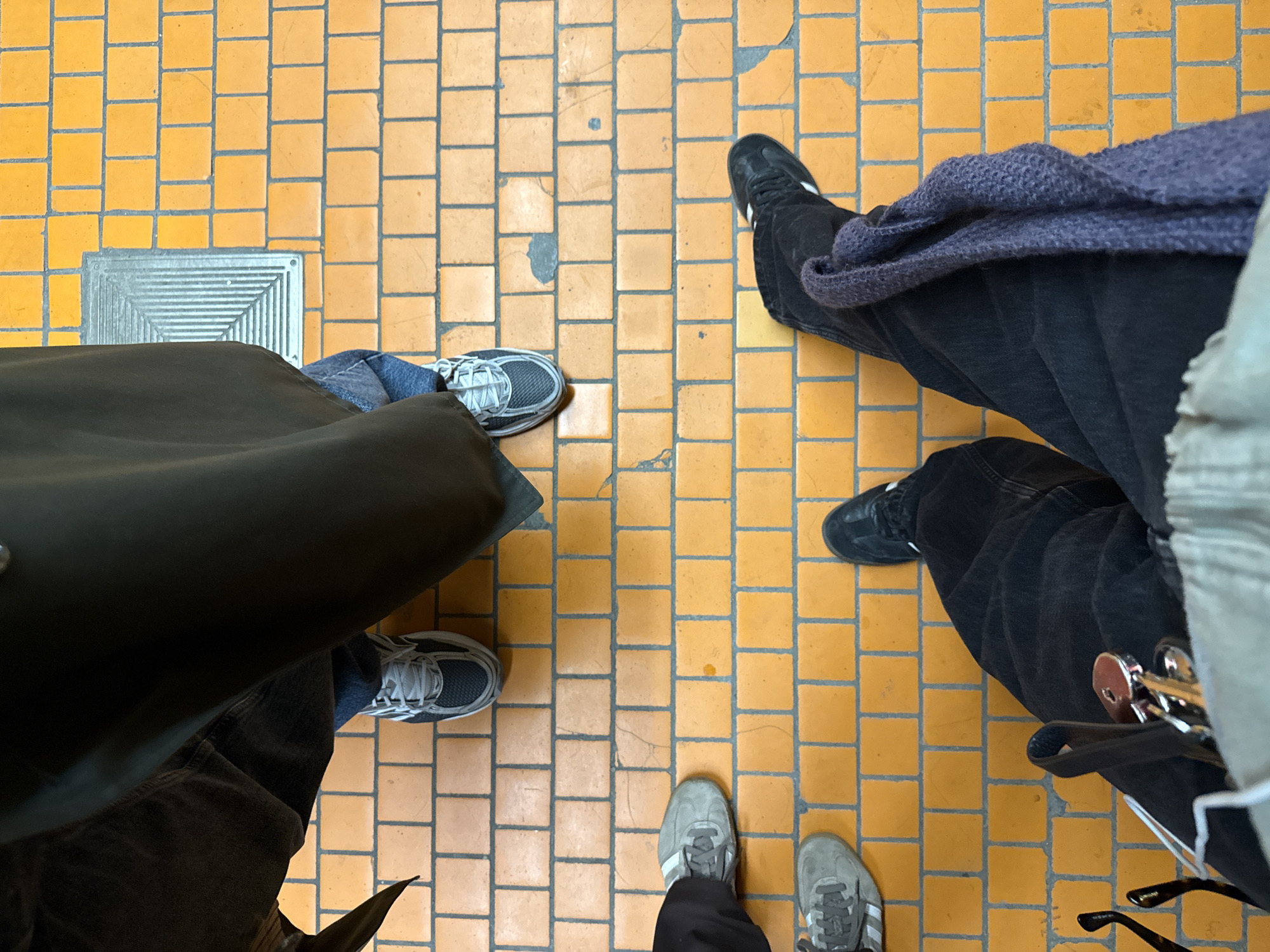 From a high-angle perspective, the image depicts a tiled floor with four individuals standing on it. The floor is composed of orange square tiles with grey grout lines. Starting from the left, the first person is wearing running shoes, jeans, and a long, dark coat. Next to them, a metal grate is partially visible. To the right, the second person is wearing running shoes, and black corduroy pants, and a light grey knitted blanket. The third person is wearing black shoes, black pants, with keys and eyeglasses hanging from their side. The fourth person is wearing grey running shoes and black pants. The picture was taken in a metro station in Montreal.
