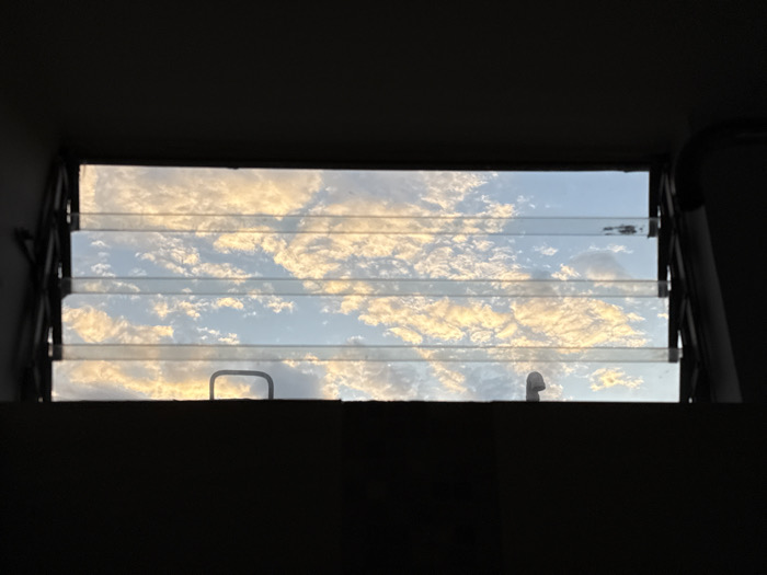A wide, horizontal photograph, captured from an interior vantage point, depicts a jalousie window overlooking an exterior sky scene