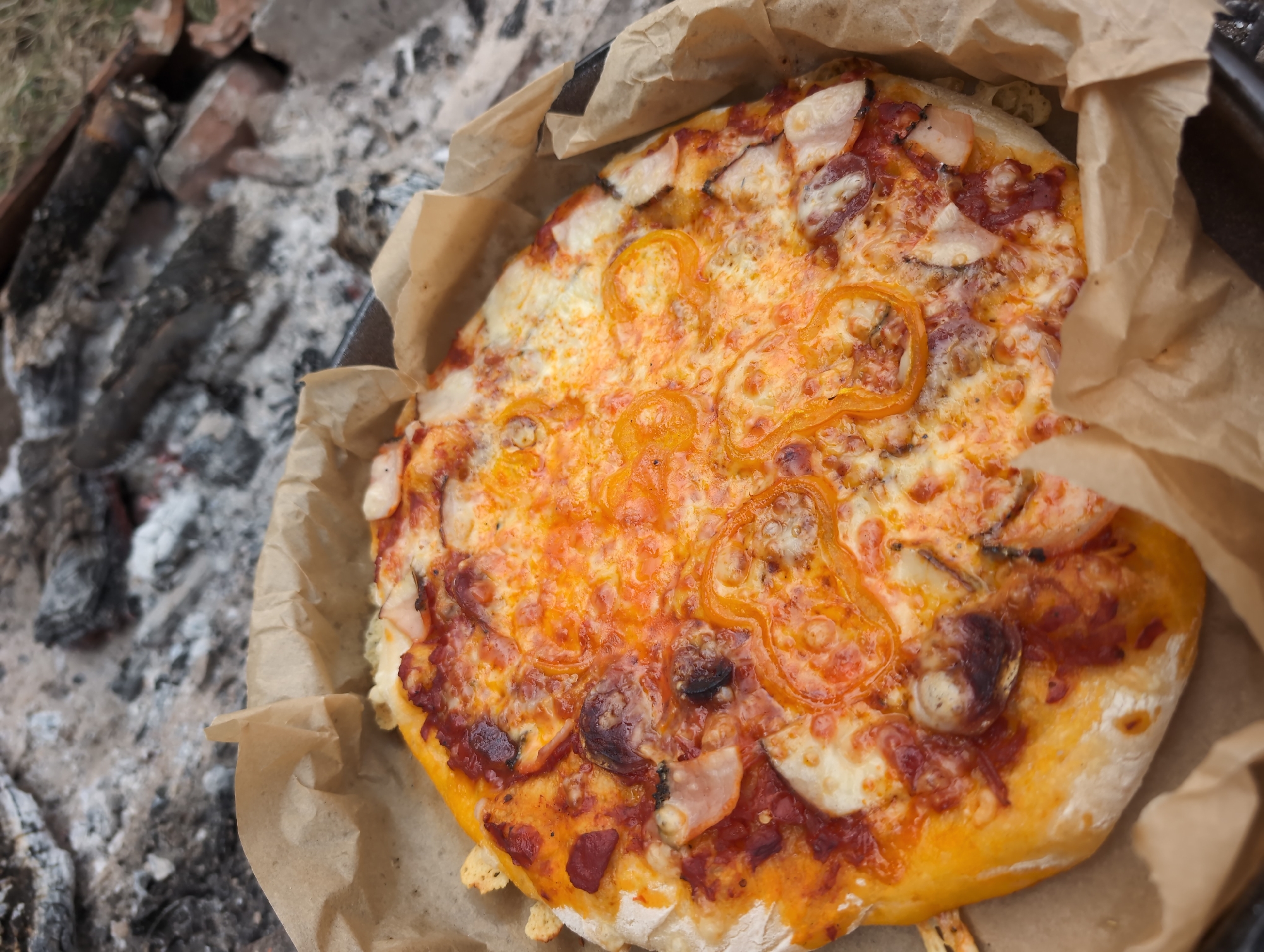 An overhead view captures a freshly cooked, round pizza resting within a dark metal pan lined with crumpled brown parchment paper. The pizza features a golden-brown crust, a red tomato sauce base, and a generous layer of melted, bubbling orange and white cheese. Toppings include dark red circular slices of sausage, light pink strips of bacon or ham, and thin, circular orange rings, possibly bell peppers. The pan is positioned directly over a bed of grey and black wood ashes and charcoal, indicating an outdoor cooking setting where a fire was present. Subtle hints of red brick and green foliage are visible in the blurry background. The scene is located in the city of Podgore, Bulgaria. No individuals, actions, or interactions are present.