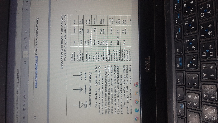 The scene depicts a black Dell laptop positioned indoors in Lhokseumawe, Indonesia, displaying a PDF document on its screen. The laptop's keyboard, featuring a QWERTY layout with additional characters, occupies the foreground. The screen shows a document titled "Artikel%20Vol%201396-10-202211104.pdf," currently on page 5 of 10. The visible content includes a header for "www.e-jurnal.pknel.ac.id" and "Politeknik Bumi Akpelni Semarang," along with publication details: "Majalah Ilmiah Gema Maritim, e-issn: 2656-629X, Vol. 24, No. 2, September 2022, pp. 95-104." The main body of the document displays "Gambar 7. Simbol Grounding," illustrating three electrical grounding symbols, and a corresponding Indonesian text explanation. To the right, a table with columns labeled "Buruk," "Sedang," and "Baik" evaluates criteria such as "Kerusakan," "Arring," "Keselamatan Personel," and "Keandalan sistem." No individuals are visible.