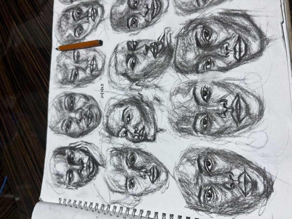 A sketchbook displays multiple quick charcoal portrait sketches of a face, each with slightly different angles and expressions