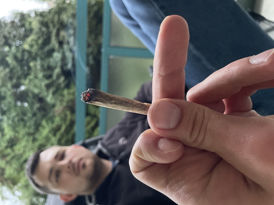 The image portrays an outdoor scene in Dortmund, Germany. In the foreground, a human right hand, with visible knuckles and short fingernails, holds a light-brown, hand-rolled cylindrical object between the thumb and index finger. The object's tip is actively burning, indicated by an orange ember and a small amount of white ash. In the midground, out of focus, a male individual is seated in a dark chair. He wears a dark hooded garment and has short, dark hair. His head is slightly tilted, and his gaze appears directed towards the camera. The lower right portion of the frame shows a partial view of a leg clad in blue denim jeans, presumably belonging to the same individual or another person present. The background, also out of focus, consists of dense green foliage, likely trees or bushes, and a light blue-green colored railing, suggesting the scene takes place on a balcony or elevated outdoor area.